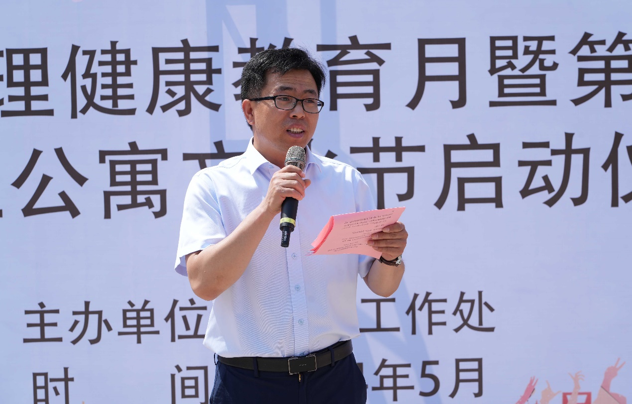 学生工作处副处长王文静在启动仪式上致辞,她说,本次心理健康教育月暨大学生公寓文化节的主题是“五育并举,共促成长”,希望各二级学院深入挖掘办学特色,打通“三全育人”各环节,聚焦学生成长发展全过程,广搭平台、五育并举,共促学生全面发展。