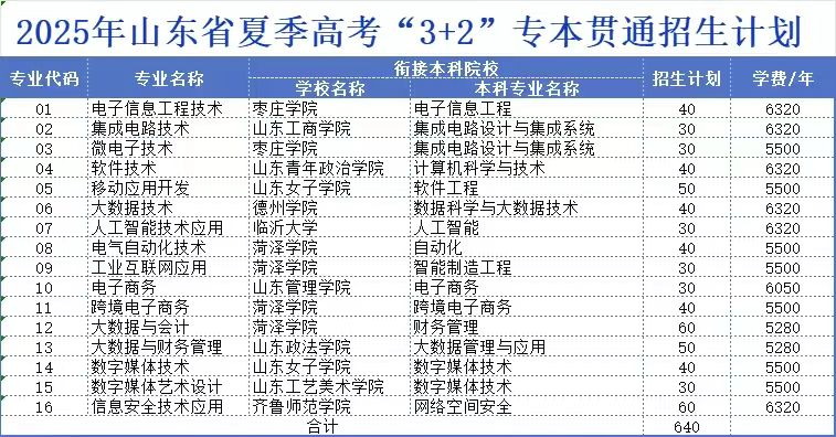 继2024年成功获批12个职业教育与本科“3+2”对口贯通分段培养试点专业后,2025年学校再迎重大突破!根据山东省教育厅最新印发的《关于下达2025年高职院校与本科高校对口贯通分段培养试点任务的通知》(鲁教办函〔2025〕11号),我校获批新增集成电路技术、人工智能技术应用等4个贯通专业,试点专业总量达16个,2025年招生规模同步扩增至640人,进一步巩固省内电子信息领域对口贯通培养“头雁”地位!