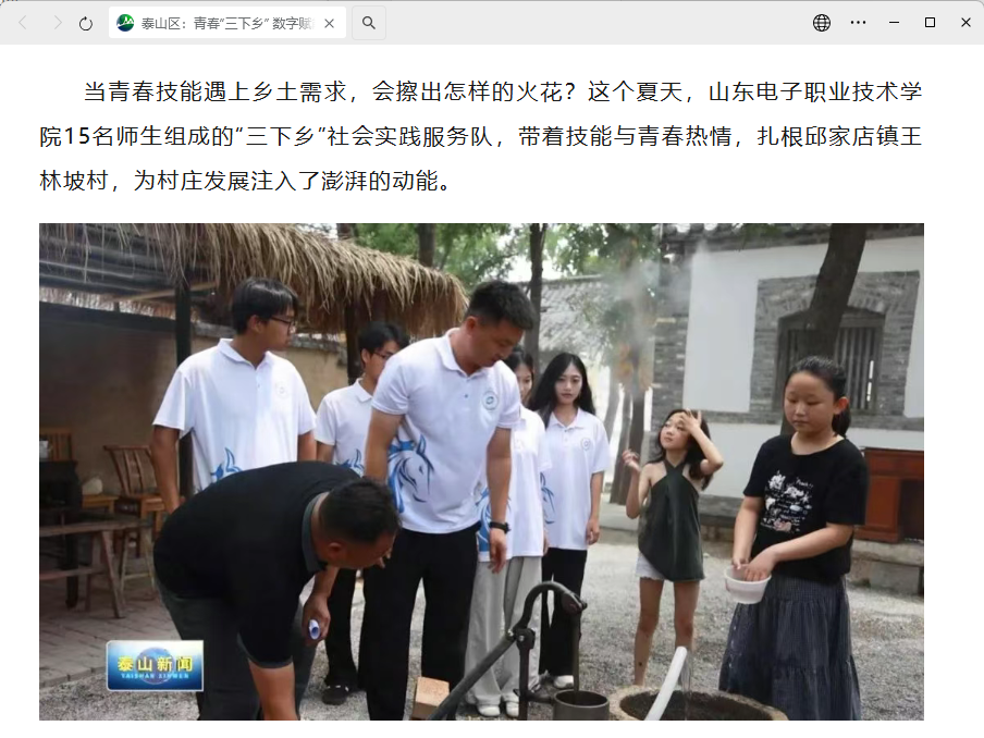 2025年7月,我院“e网情深”实践团赴泰安市泰山区邱家店镇王林坡村开展了为期12天的暑期“三下乡”社会实践活动。活动得到泰山区电视台、泰安日报、齐鲁网、中国新闻网等12家媒体关注报道,成为展现当代青年学子担当与风采的生动缩影。