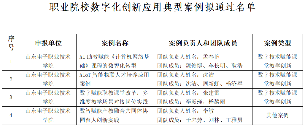 近日,中国职业技术教育学会教育数字化工作委员会公布了《职业院校数字化创新应用典型案例拟通过名单》。在全国职业院校申报的案例中,共77所院校的107个案例入选。我校“AI助教赋能《计算机网络基础》课程的数智化转型”等4个案例成功入围,入选数量位列第一,彰显了学校在职业教育数字化转型中的创新实力与示范引领作用。
