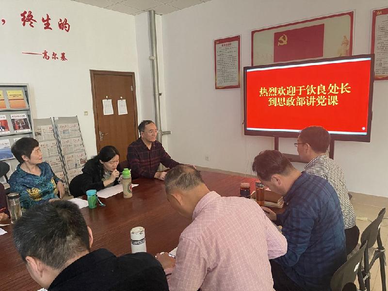 思政部党支部书记张同胜作总结讲话。他指出,于处长的党课准备充分,讲授得十分精彩,激情洋溢。这次党课,以详实的党史事实、丰富的图片视频、生动的故事给我们上了一堂党史思政大课,是一次党课,更是一次党史教育课。思政部党支部党员听了于处长的党课,深感受益匪浅,一致表示要学党史、践初心,坚守共产党人的理想信念,永志不忘革命烈士为之流血牺牲的远大理想,传承好红色基因,切实扛起新时代教师党员应肩负的历史使命!