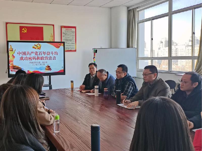 11月23日,思政部党支部召开党史学习教育座谈会,支部书记张同胜以“中国共产党百年奋斗的成功密码和政治宣言—学习贯彻党的十九届六中全会精神”为主题为支部党员讲党课,思政部全体党员参加学习。