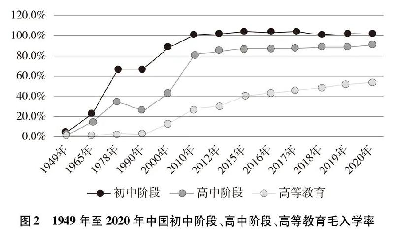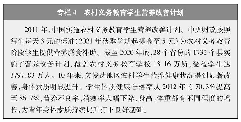教育机会更加均等。中国教育事业优先发展不断深化,中国青年享有更加平等、更高质量的教育机会。2021年,中国义务教育巩固率达95.4%;高中阶段毛入学率达91.4%;高等教育毛入学率达57.8%、在学总规模达4430万人,居世界第一,越来越多的青年打开了通往成功成才大门的重要路径。覆盖学前教育至研究生教育的学生资助政策体系建成且日趋完善,2020年资助资金总额超过2400亿元、资助学生近1.5亿人次,实现“三个全覆盖”②。义务教育阶段进城务工人员随迁子女、农村和贫困地区学生等群体受教育权益得到充分保障。2020年,85.8%的进城务工人员随迁子女在公办学校就读或享受政府购买学位服务;2012年至2021年,农村和贫困地区重点高校专项招生计划定向招生超过82万人,让更多的青年公平享有接受更好教育的机会,阻断贫困的代际传递。