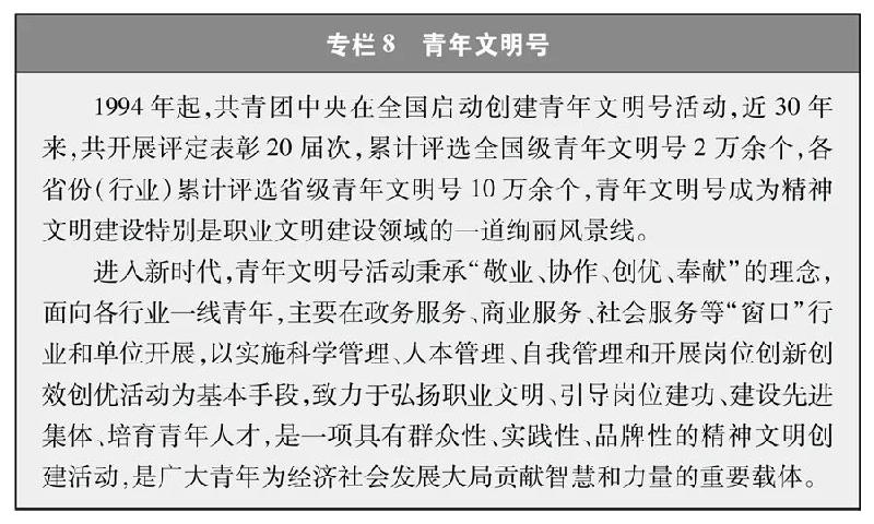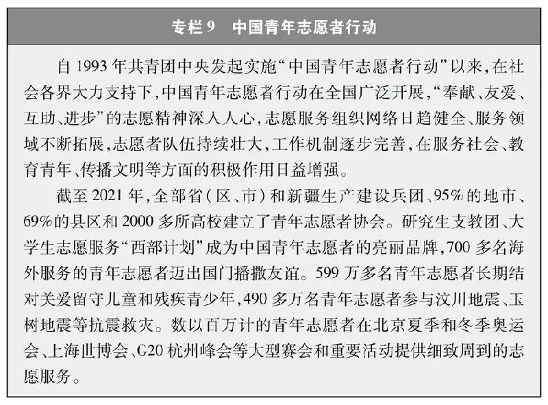 无论在城镇还是乡村、企业还是学校,青年都自觉把正确的道德认知、自觉的道德养成、积极的道德实践紧密结合起来,带头倡导向上向善社会风气、塑造社会文明新风尚。在城乡社区建设中,越来越多的青年投身社区治理和服务体系建设,主动参加“社区青春行动”,加强实践锻炼、提升服务贡献。在各行各业,青年秉承“敬业、协作、创优、奉献”的理念,踊跃创建“青年文明号”,大力弘扬新时代职业文明,展现新时代职业形象。广大青年运动员弘扬体育道德风尚,以良好的赛风赛纪和文明礼仪,获得竞技成绩和精神文明双丰收。1993年“中国青年志愿者行动”启动以来,志愿服务成为青年参与社会治理、履行社会责任的一面旗帜,成为青年在奉献人民、服务社会中锻炼成长的重要途径。截至2021年底,全国志愿服务信息系统中14岁至35岁的注册志愿者已超过9000万人,他们活跃在社区建设、大型赛事、环境保护、扶贫开发、卫生健康、应急救援、文化传承等各个领域,弘扬“奉献、友爱、互助、进步”的志愿精神,在全社会形成团结互助、平等友爱、共同前进的新风尚。中国青年志愿者扶贫接力计划研究生支教团、大学生志愿服务“西部计划”连续18年派遣41万余名研究生、大学毕业生,到中西部2100多个县(市区旗)开展扶贫支教、卫生医疗等志愿服务。青年始终是大型赛会志愿服务的主体力量,给千家万户乃至全世界留下深刻印象。