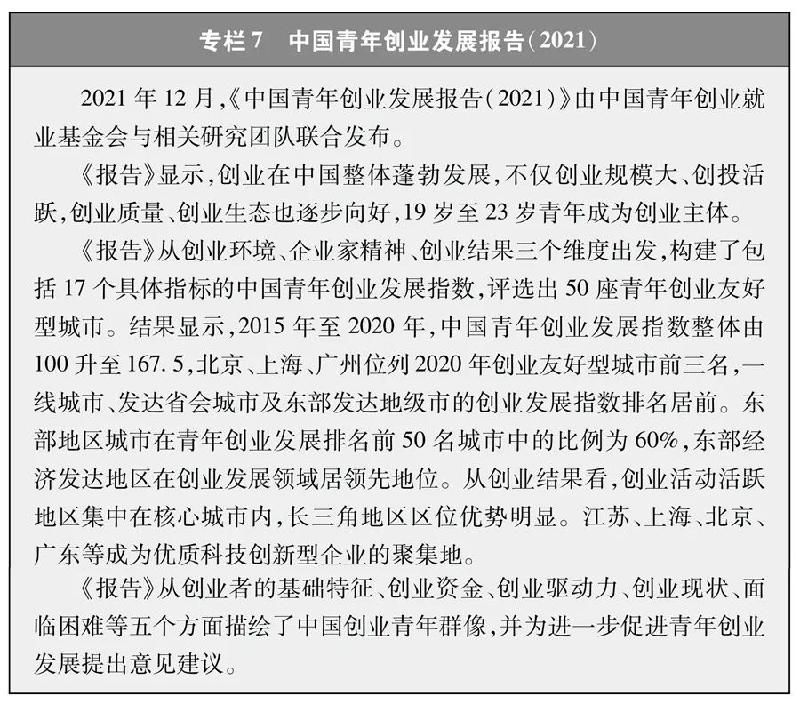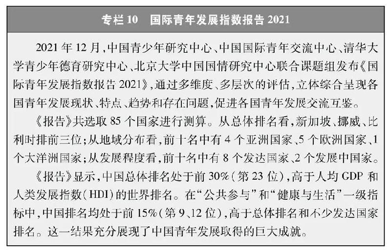 政策保障日益完备。针对中国青年多元化发展需求,国家强化政策服务导向,健全完善政策体系。国民经济和社会发展“十三五”和“十四五”规划鲜明体现青年元素,科教兴国、人才强国、创新驱动发展、乡村振兴、健康中国等国家重大战略充分关注青年群体,青年发展得到越来越多的顶层设计支持。2017年4月,中共中央、国务院制定出台新中国历史上第一个国家级青年领域专项规划——《中长期青年发展规划(2016-2025年)》,为新时代中国青年发展提供根本政策指引。针对青年在毕业求职、创新创业、社会融入、婚恋交友、老人赡养、子女教育等方面的操心事、烦心事,党和政府高度重视,各项政策举措持续出台,青年发展型城市建设蓬勃开展,青年优先发展理念日益深入人心。目前,从中央到地方的青年工作机制基本建成,具有中国特色的青年发展政策体系初步形成。青年充分享受政策红利,实实在在感受到关爱就在身边、关怀就在眼前。