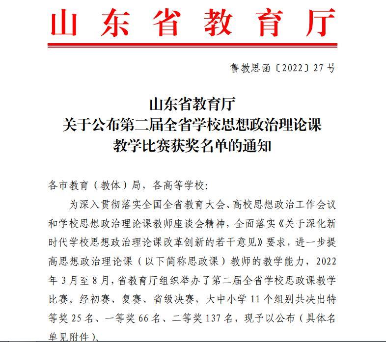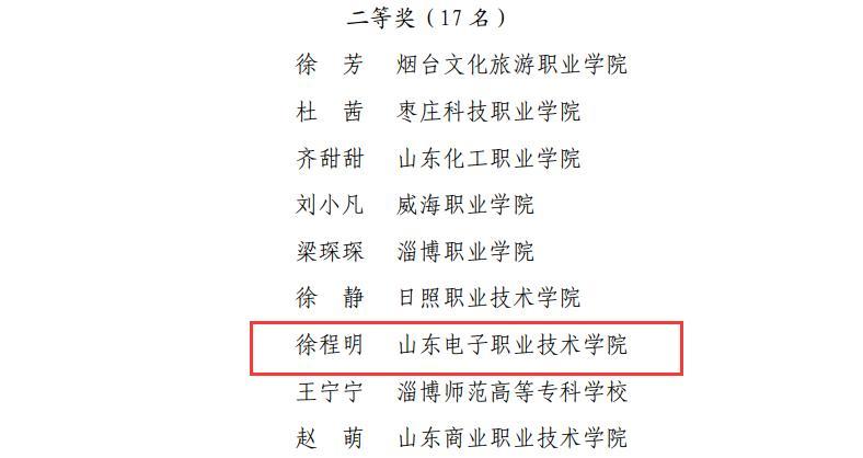 近日,山东省教育厅发布《关于公布第二届全省学校思想政治理论课教学比赛获奖名单的通知》(鲁教思函〔2022〕27号),我校徐程明老师荣获高职高专基础组二等奖。
