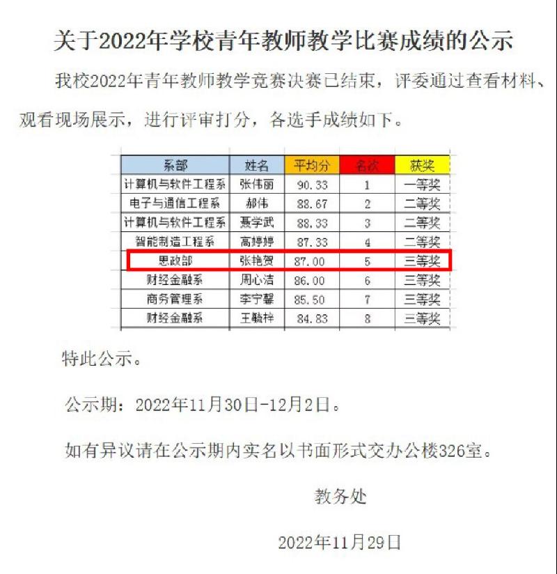 2022年11月底,学校举办2022年青年教师教学比赛。在决赛中,我部教师张艳贺讲授精彩,沉着发挥,凭着优秀的教学素养和专业能力,在比赛中荣获三等奖。