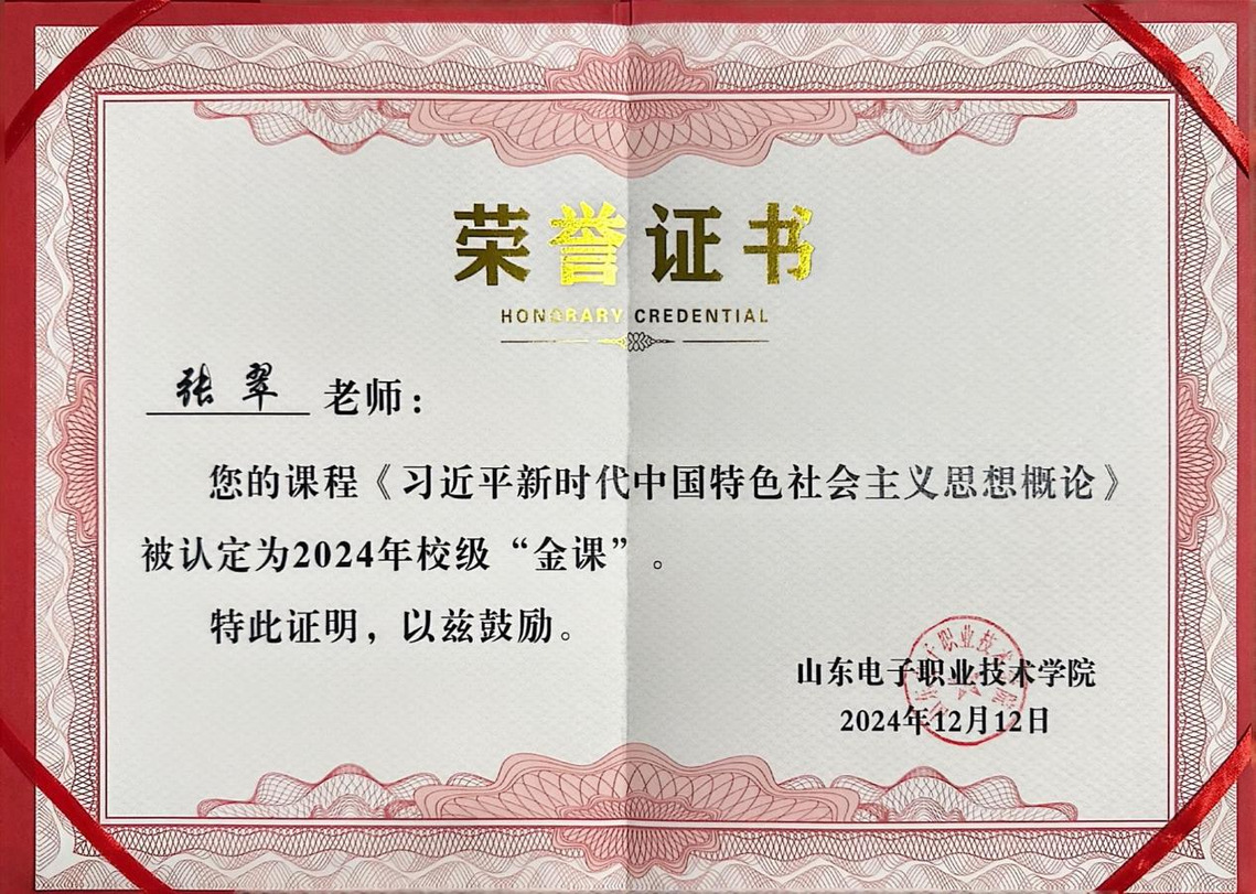 近日,我校思政部张翠老师讲授的课程“习近平新时代中国特色社会主义思想概论”经过个人申报、院部推荐、学校认定等程序,在激烈的竞争中脱颖而出,被认定为2024年校级“金课”。这一殊荣,不仅是对该教师长期以来坚持高质量教学的肯定,也是对思政部课程建设的有力推动。