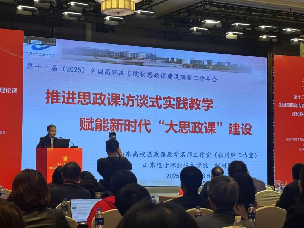 近日,第十二届(2025)全国高职高专院校思想政治理论课建设联盟工作年会在湖北武汉成功举办。本次年会由全国高职高专院校思政课建设联盟主办,武汉职业技术大学承办,来自全国281所院校的400余名思政课骨干教师、马克思主义学院负责人齐聚一堂,共商思政课改革创新路径。我校思政部主任、山东高校思政课教学名师工作室主持人张同胜应邀在会上作典型经验发言。