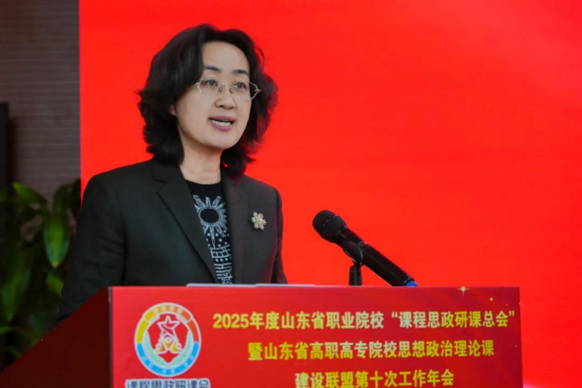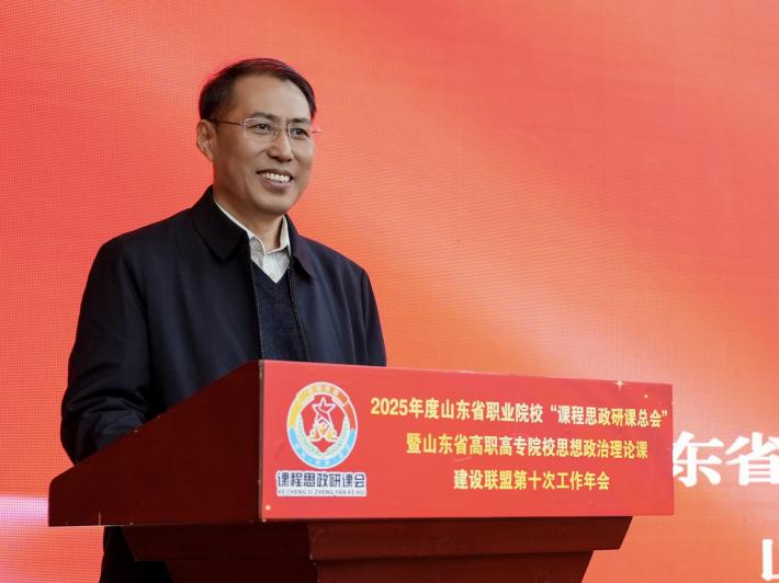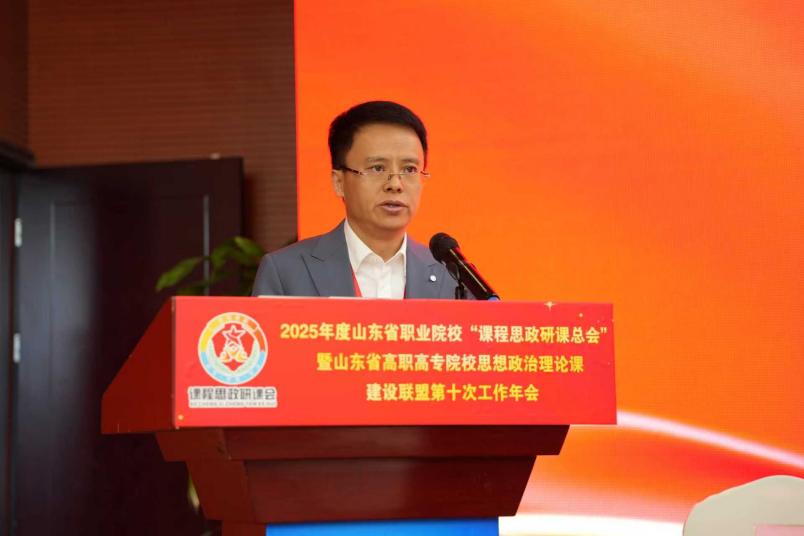 邢桂强在讲话中,祝贺会议召开,强调协会通过搭建教研平台,汇聚育人合力,为山东职业教育高质量发展注入动能,并呼吁思政教育者面向“十五五”注重价值塑造、系统推进、数字赋能与文化浸润,永葆“国之大者”胸怀,锻造“大先生”风范,弘扬“工匠精神”气质,书写职教高质量发展新篇章。