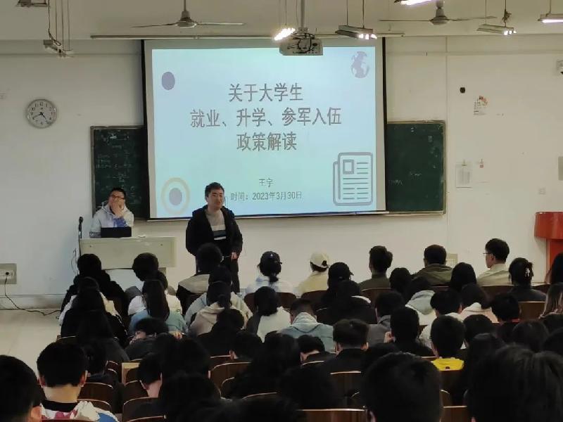 为了切实保障同学们对于就业工作的稳步推进,懂得升学的重要性,激发同学们了解参军入伍政策,我系于2023年3月30日在阶梯教室开展《关于大学生就业、升学、参军入伍政策解读》主题讲座,本次讲座由王宇老师主持,我系部分同学参加。