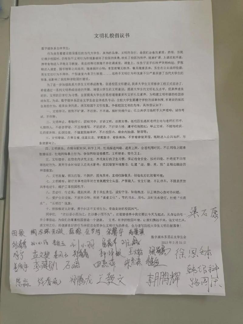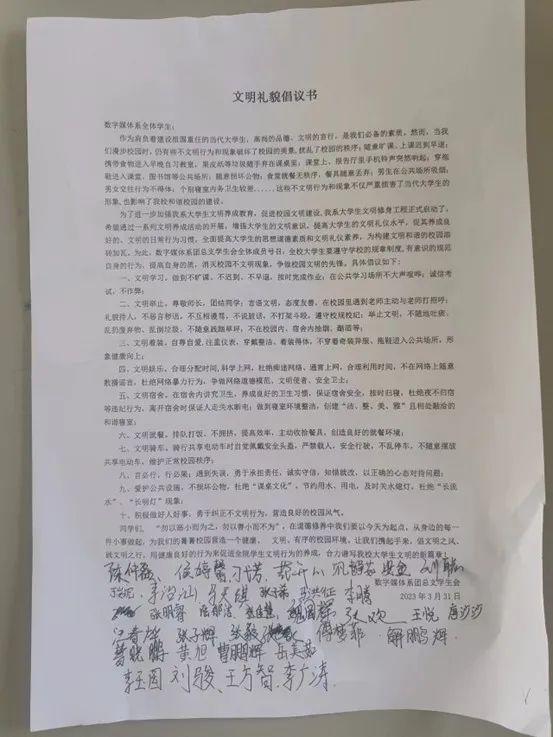 活动结束同学们在文明礼貌倡议书上庄重地签下自己的名字,纷纷表示要成为一名新时代文明大学生,为文明校园增光添彩!亲爱的同学们,让我们行动起来,让建设文明校园不再是简单的口号,而成为每个学生修身律己、为之奋斗的目标,让我们积极参与到创建文明校园活动中来,共建和谐校园,争做文明大学生!