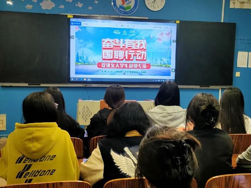 我系积极响应教育部妇联号召,组织大二大三女大学生参加“奋斗有我 国聘行动”促进女大学生就业专场招聘推进活动,助力提高女大学生实习就业去向落实率。我系女大学生在观看招聘岗位的同时,也根据自己的专业特长,积极寻找适合自己的实习就业岗位。时机总是青睐于那些有准备的人,本次招聘也提醒女大学生们要以更加饱满的精神状态对待今后的工作、生活与学习,不断提升自己的综合素质,为以后的就业做好准备。