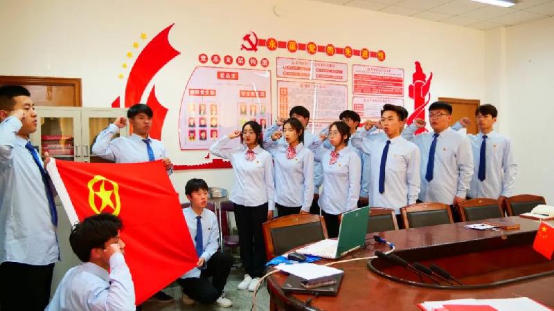 亓一鸣领誓,十名新团员向着团旗庄严宣誓,宣誓词坚定了新团员为团的事业奋斗终身的信念。