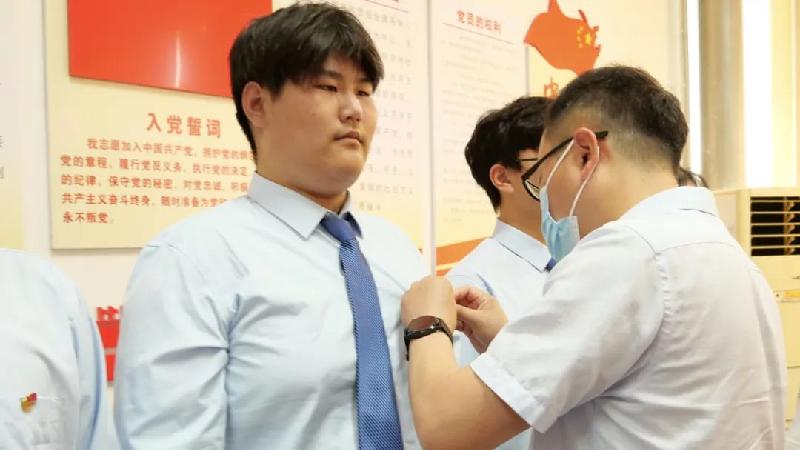 颜培园、王南丁、刘兰宁、袁亚飞为10位新团员佩戴团徽,并祝贺他们成为光荣的共青团员。