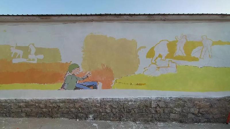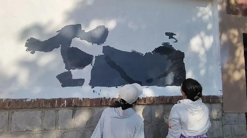 一幅墙绘作品的绘制需要一系列步骤,从确定墙绘主题、设计墙绘图案、尺幅,到绘制边框、构图上色、调整细节,诸多流程不仅是对专业技能的检阅,也是对体能意志的考验。经过同学们的不懈努力,原本单调乏味、毫不起眼的墙面逐渐变得活泼富有生机,同学们展现出来的技艺和不怕苦不怕累的精神也获得了村民们的赞扬。