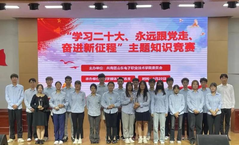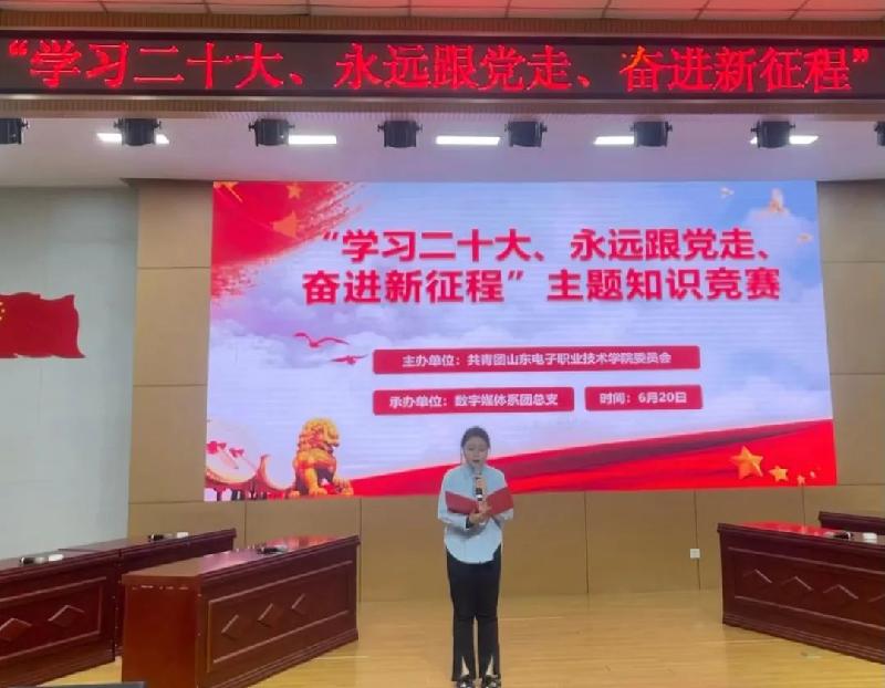 为深入学习宣传贯彻党的二十大精神,发扬党百年来的伟大建党精神,丰富学生校园文化生活,提高综合素质,营造积极向上的校园文化氛围,2023年6月20日山东电子职业技术学院于学术报告厅开展以“学习二十大,永远跟党走,奋进新征程”为主题的知识竞赛。本次比赛由共青团山东电子职业技术学院委员会主办,数字媒体系团总支承办,由我系团总支书记颜培园,各系辅导员代表出席此次活动,21、22级全体同学参加。