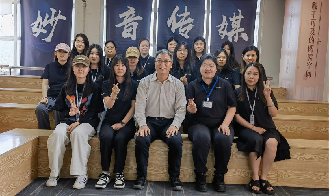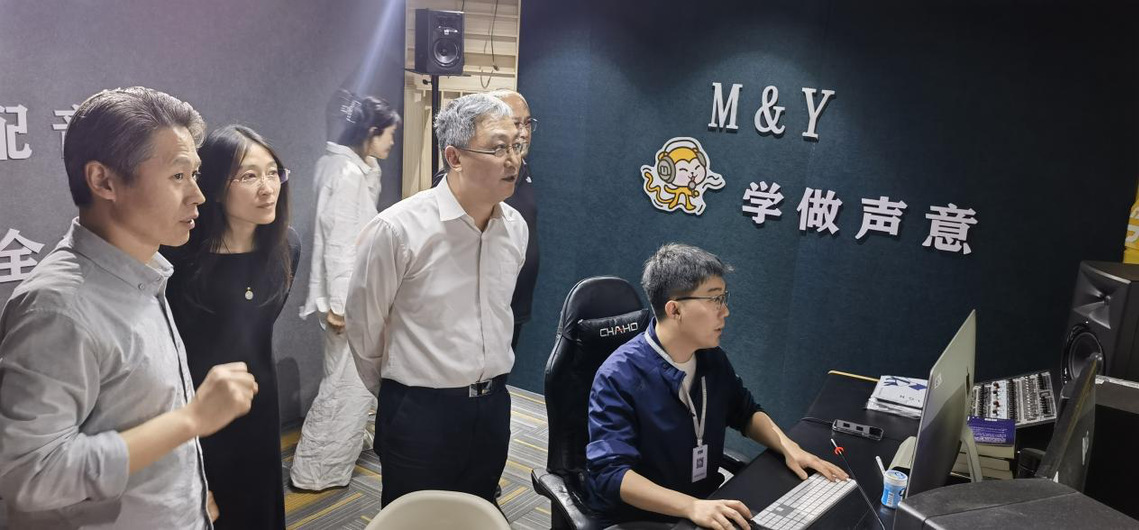 在山东妙音文化传媒有限公司,毕丛福一行在参观完公司的录音棚和制作室后,双方就文化产业的发展趋势和人才培养问题进行了深入交流。目前有23名来自我校的学子工作在妙音的各个岗位上,任慧莉、徐倩倩、桑媛媛三位校友已在妙音任职九年,毕丛福一行与各位校友进行座谈,邀请大家常回学校看看。