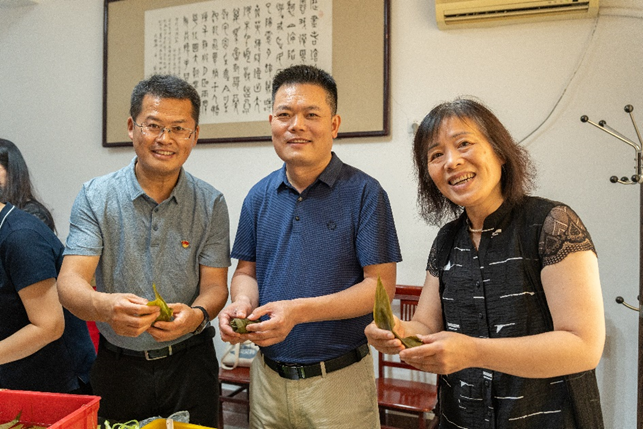 学校工会主席齐学民、工会副主席董弘也受邀一同参与本次活动,同大家一起包粽子、品美食,话安康。他们给大家送上节日问候,并对二级工会自主开展特色主题活动给予了高度赞扬和充分肯定。活动最后,老师们将包好的粽子和备好的美食送到在场学生们的手中,使同学们受到节日的温馨和学院大家庭的关爱。