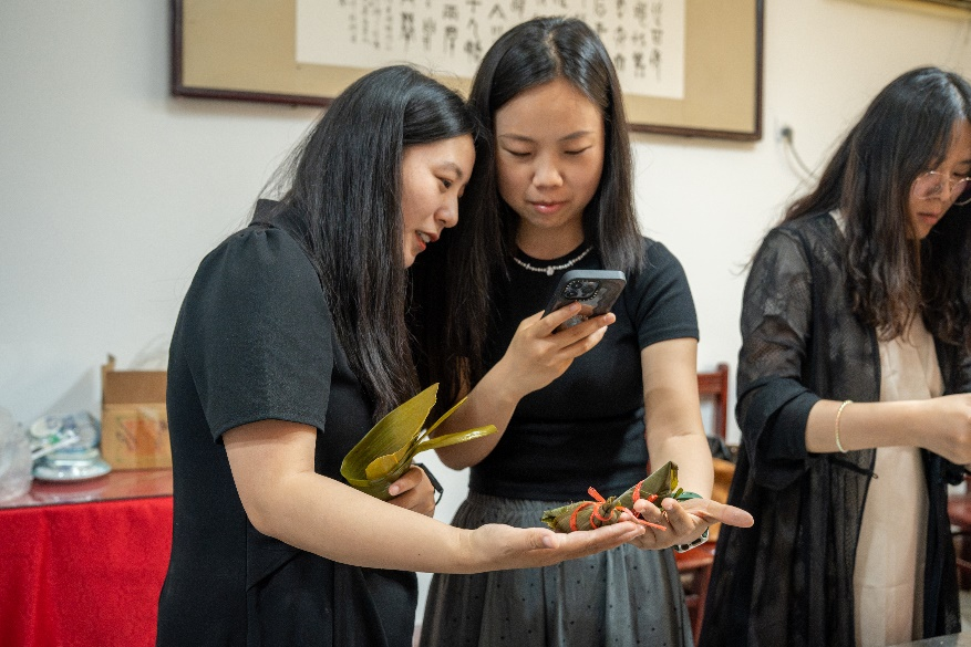 活动现场,糯米、蜜枣、酱肉、粽叶、彩绳等食材、道具一应俱全,大家摩拳擦掌、跃跃欲试,在学院党总支岳卫华的带动下尝试动手捋粽叶、填糯米、装馅料、裹叶子、扎线……不少老师都是第一次亲手包粽子,虽然开始时做得慢一些,但也包出了一个个看起来大小不一又独具创意的粽子……随着老师们动作越来越熟练,包的粽子越来越好看、越来越多。大家巧手翻飞,齐心协力包香粽,丰富有趣的传统端午节特色活动现场其乐融融,洋溢着欢乐祥和的节日气氛。