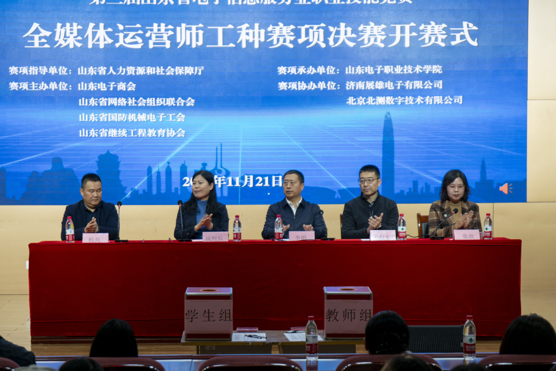 比赛由山东电子商会、山东省网络社会组织联合会、山东省发国防机械电子工会及山东省继续工程教育协会主办,山东电子职业技术学院承办。11月21日开赛式上,山东电子职业技术学院副院长王毅东代表承办校致辞,对大赛指导专家、裁判及参赛院校师生表示热烈欢迎,介绍学校在电子信息领域的专业优势及数字媒体专业群的特色发展,表示将以一流的技术与服务完成好承担的各项任务。山东省网络社会组织联合会秘书长李明代表主办方致辞,表示本次大赛注重全媒体运营师的职业发展规划和人才梯队建设,不仅推动全媒体运营师的职业技能培训和认证工作,而且为全媒体运营师提供了广阔的职业发展空间和机会,激励从业者不断提升自己的专业技能和综合素质,为行业的持续健康发展贡献自己的力量。开赛式上,裁判长进行了赛项说明,承办方组织各参赛队有序地进行了顺序号的抽取。