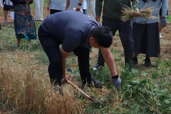 学院党总支书记岳卫华在主持中为师生普及芒种及“三夏”知识,呼吁大家在这个丰收的时节,拿起工具忙碌起来,共同体验劳动的美德,体会收获的喜悦。现场展示传统手工割麦操作规范,讲解劳动安全防范。柏一星在讲述自己曾经五年乡镇工作及亲身参加农事的经历,讲解有关小麦的知识故事,并隆重宣布“开镰”,激励大家在这片沃土上以劳动开启智慧与收获。