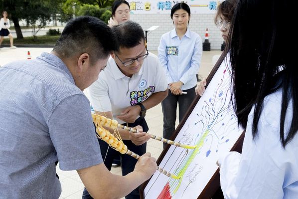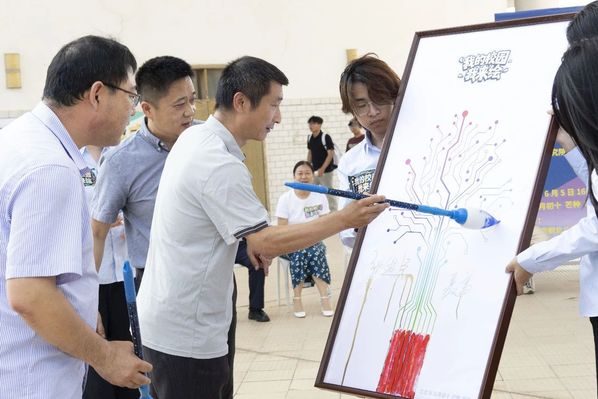 绘制开启环节别出心裁。只见“龙马之翼号”无人机缓缓驶入活动现场,送来五谷之笔、代码之笔、麦穗之笔。与会领导先后执“五谷笔”开启地绘第一笔,寓意学校扎根优秀传统文化;执“代码笔”落下第二笔,展现新一代信息技术与数字赋能;持“麦穗笔”完成第三笔,象征学校必将收获丰硕的育人成果。