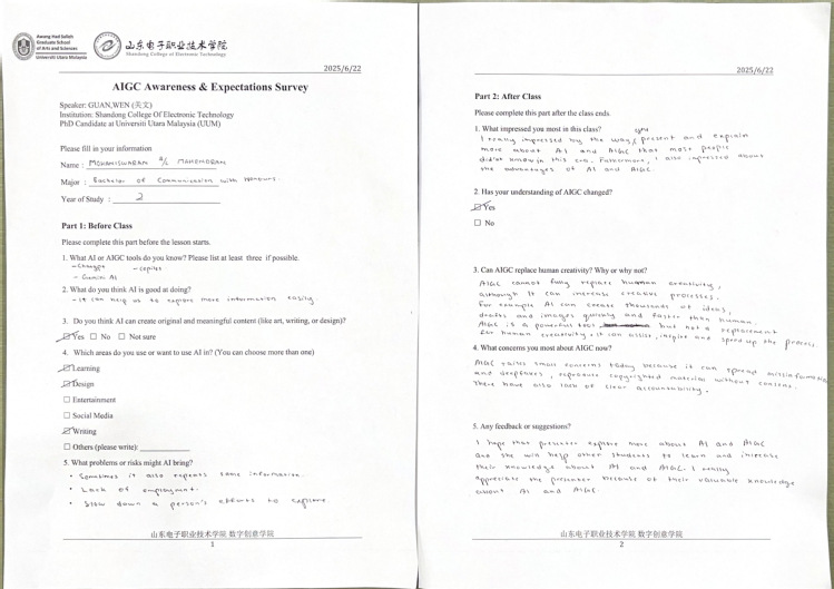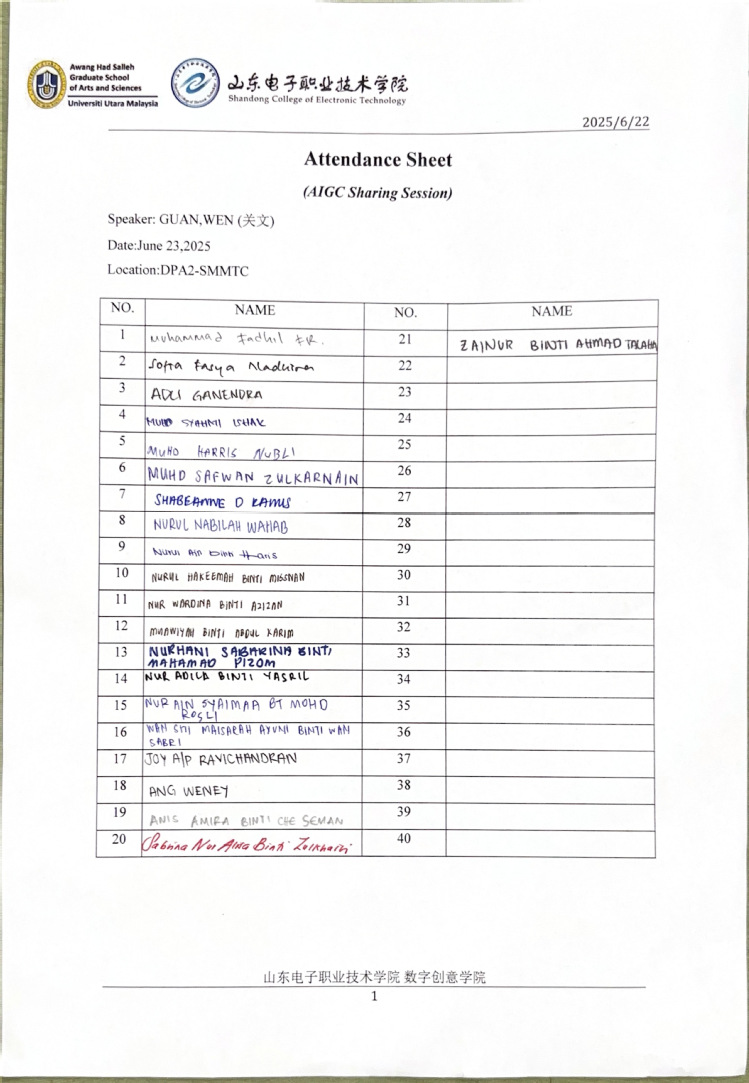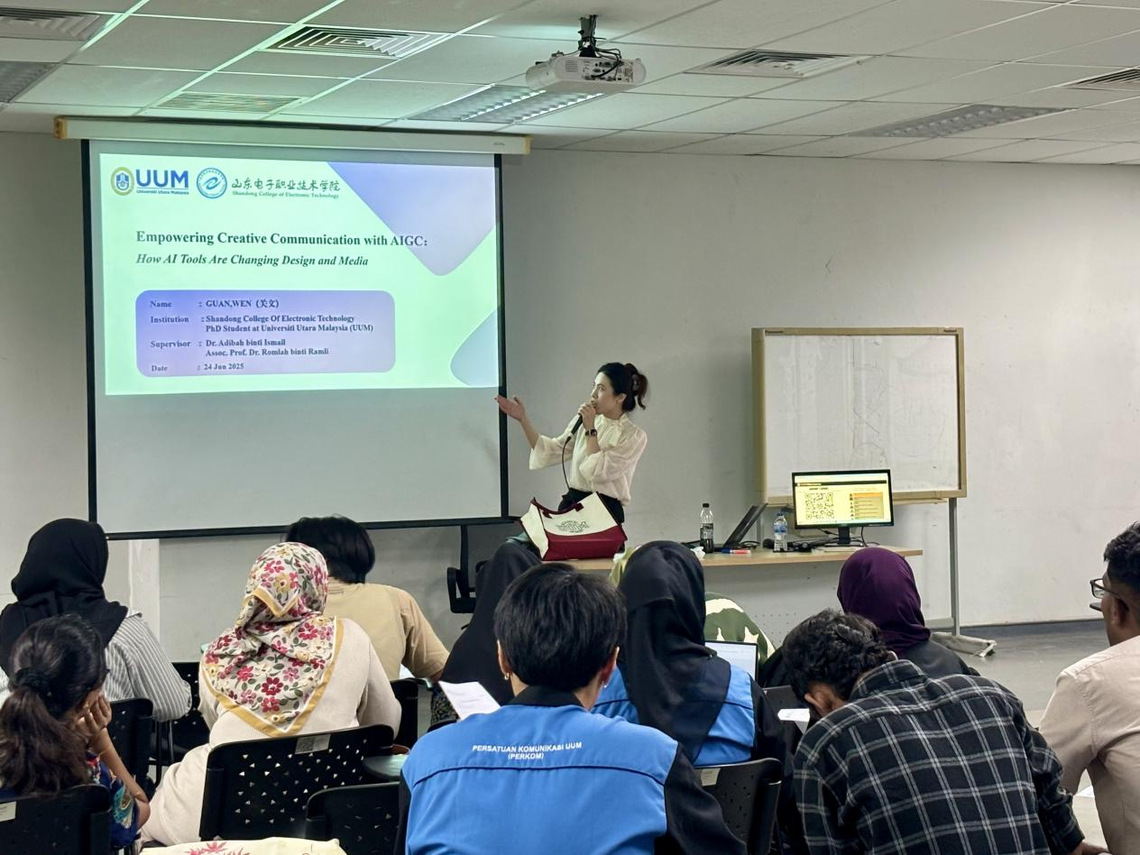 为积极响应“职业教育出海”战略,推动人工智能与数字创意领域的国际交流合作,6月23日,山东电子职业技术学院数字创意学院教师关文,受邀在马来西亚北方大学(Universiti Utara Malaysia,简称UUM)为传播学三年级本科生开展了一场主题为《Empowering Creative Communication with AIGC》的实训型课程分享与技能培训活动。