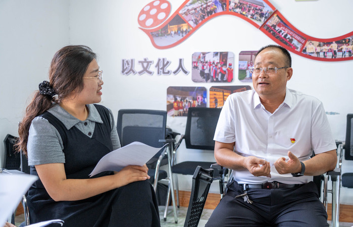 在杨楼村村委会,村支书杨学伟与指导老师程新宇及服务队成员,就当地餐馆经营、文化活动开展及特色推广等议题深入研讨。