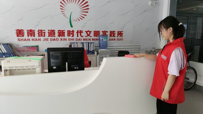 S24004班的庞秋玥同学在滕州市善南街道清华园社区服务站。她耐心为居民提供咨询引导、介绍业务办理流程,擦拭便民服务台与等候座椅;将档案按楼栋分类归档并制作检索目录,用贴心服务让基层办公更高效。