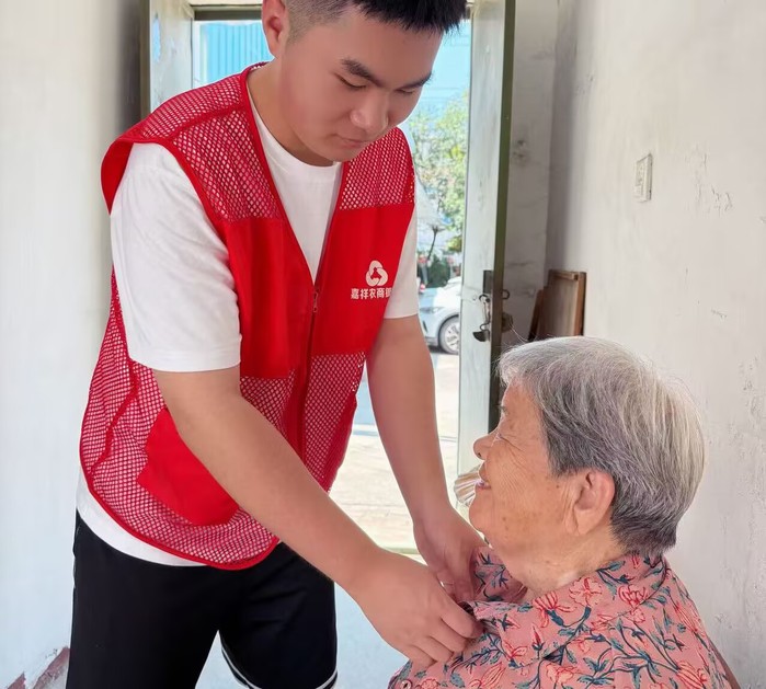 S24006班的赵子瑄同学在济宁市嘉祥县农银家苑社区开展助老服务活动。他详细登记老人健康信息并核对紧急联系人电话,