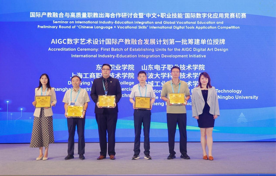 在研讨会主论坛现场,学校凭借在数字艺术设计领域的教学积累与产教融合实践,成功被授予AIGC 数字艺术设计国际产教融合发展计划筹建单位与中塔技术技能提升建设联盟成员单位两项称号。这两项授牌既是行业对学校数字创意领域教学成果的高度认可,也为学校搭建了更广阔的国际合作平台。未来可依托 AIGC 数字艺术设计产教融合计划,深化与国际企业、院校在数字艺术人才培养上的协同;借助中塔技术技能提升建设联盟,拓展与塔吉克斯坦等“一带一路”沿线国家在职业技能培训领域的合作,推动职业教育“走出去”。
