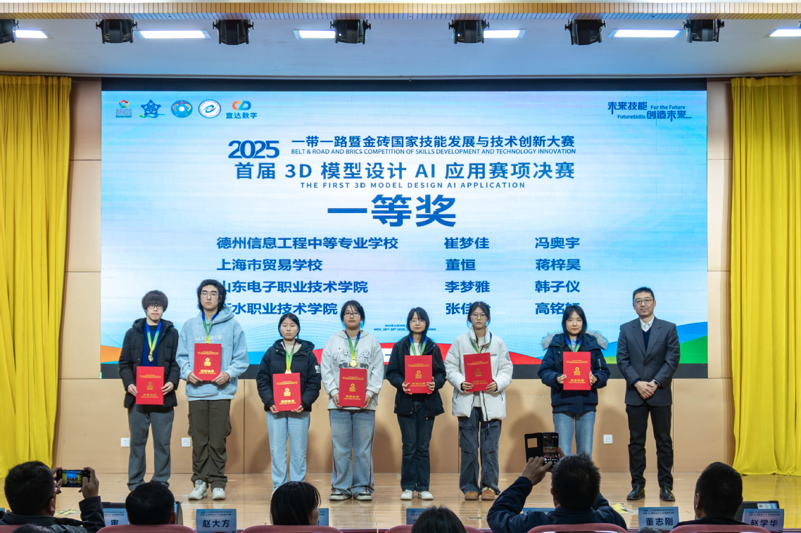 11月28日至30日,2025“一带一路”暨金砖国家技能发展与技术创新大赛首届3D模型设计AI应用赛项决赛在山东电子职业技术学院举办。本次比赛汇聚全国13个省(含直辖市)的60支参赛队伍、100名选手同台竞技,最终评选出一等奖9支、二等奖15支、三等奖23支队伍,山东电子职业技术学院等承办及支持单位获“突出贡献奖”。