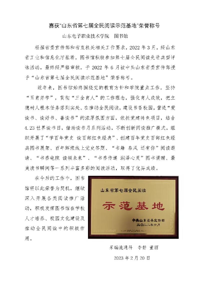 喜获“山东省第七届全民阅读示范基地”荣誉称号
