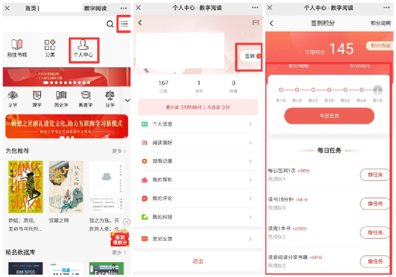 3、登录畅想之星电子书平台后,点击个人中心→签到→完成每日任务即可获取积分参与活动。