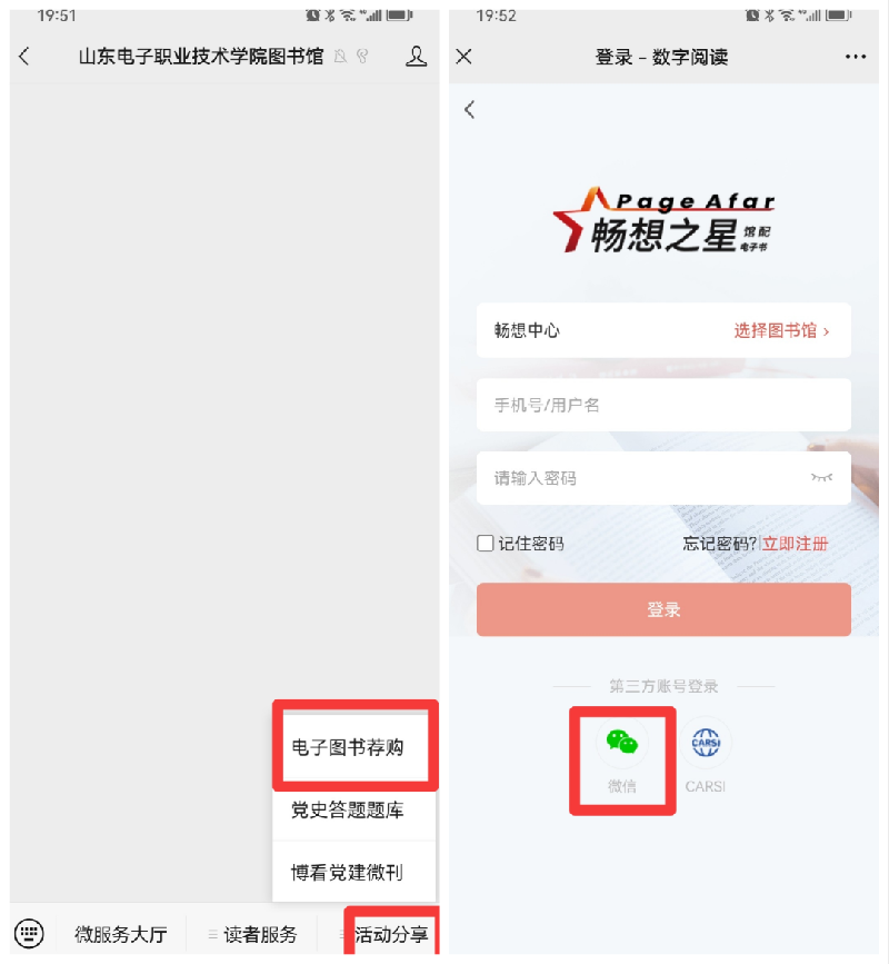 1、关注山东电子职业技术学院图书馆公众号→活动分享→电子图书荐购→微信登录