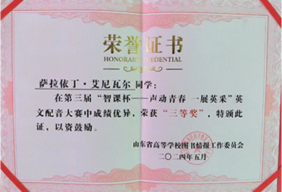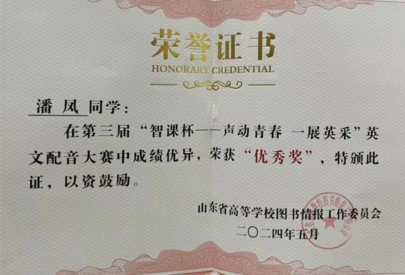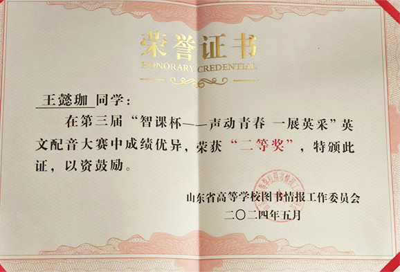 在近日落下帷幕的第三届“智课杯--- 声动青春一展英采”英文配音大赛中,山电学子首次亮相便大放异彩。他们凭借卓越的才能和不懈的努力,与山东大学等其他高校学子同台竞技,取得了二等奖1项,三等奖1项,优秀奖1项的优异成绩。