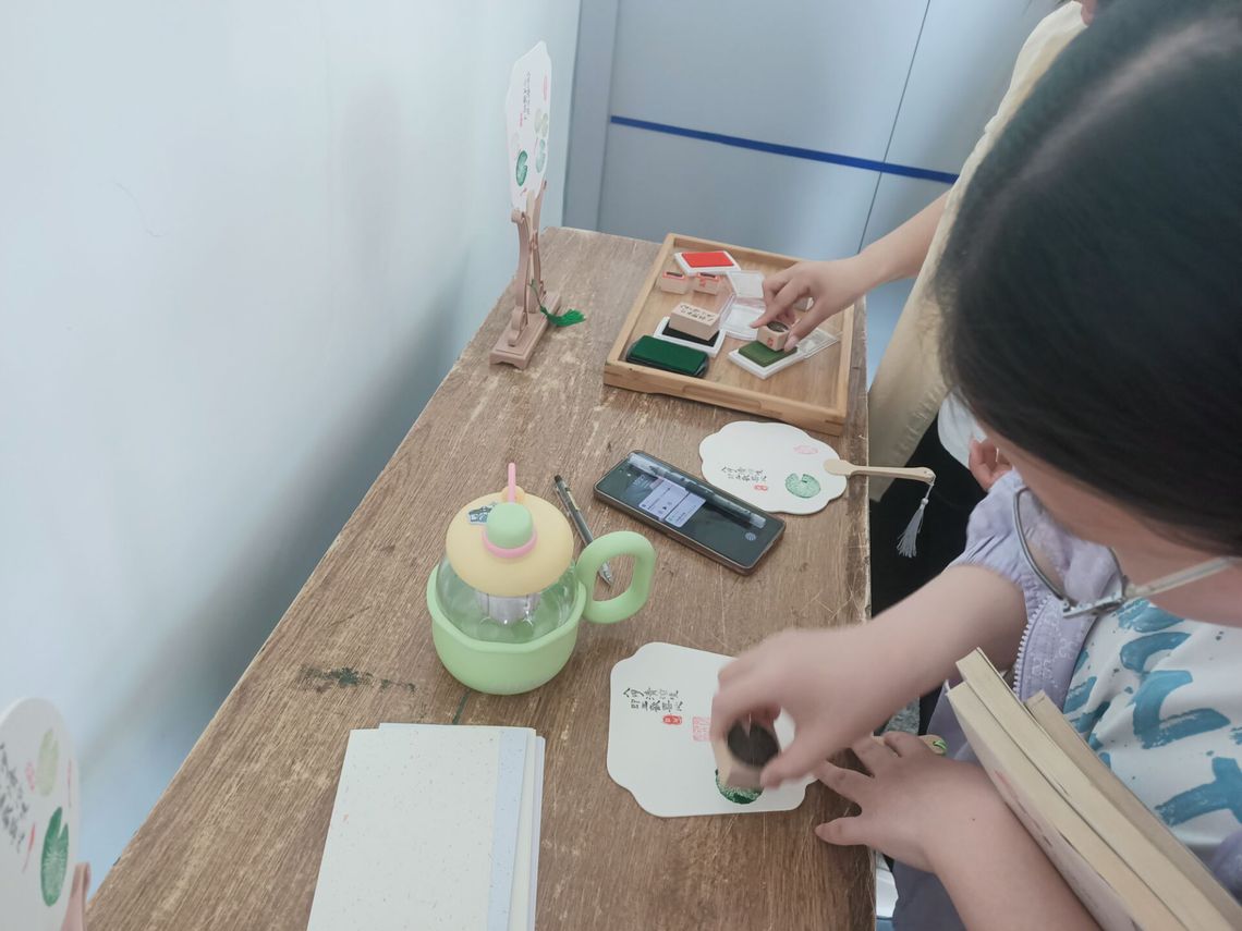 活动期间,在图书馆借阅书籍的读者都可以领取到一张荐书卡,大家在卡片上认真写下自己最喜爱的一本书,搭建起了一座交流的桥梁,在书香中碰撞出思想的火花。完成荐书分享后收获空白纸扇一把,大家尽情发挥想象力,用图书馆特制印章在扇面上进行巧妙组合,打造出一幅幅独具个性的夏日最IN文创单品。