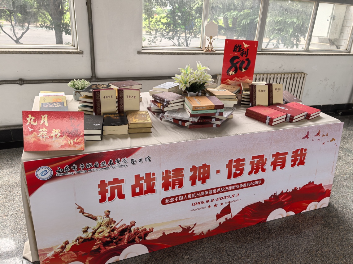 新学期伊始,适逢中国人民抗日战争暨世界反法西斯战争胜利80周年,学校图书馆一楼大厅推出“抗战精神 传承有我”主题微书展,以书籍为媒介,无声地传递着历史的厚重与精神的延续。