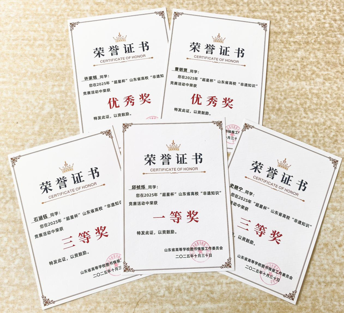 近日,由山东省高等学校图书情报工作委员会主办的“超星杯” 山东省高校“非遗知识”竞赛圆满落幕。本次竞赛吸引全省 90 余所高校的 11000 余名学子参与竞技,我校图书馆高度重视,精心组织、广泛动员,共组织 1926 名在校学生参与竞赛,凭借出色表现斩获多项荣誉——学生个人获一等奖 1 项、三等奖 2 项、优秀奖 2 项,我校图书馆获评“优秀组织奖”。