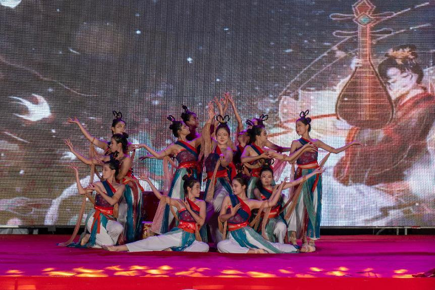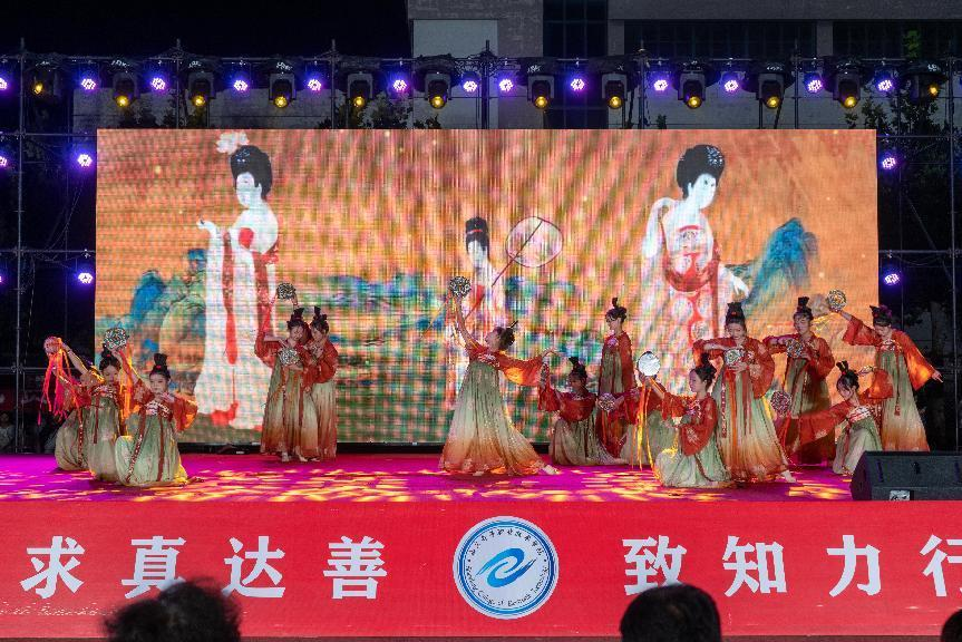 学校大学生艺术团织月民俗艺术队带来了舞蹈《梦回大唐》。唐朝,那个中国历史上最辉煌的时代,以其开放包容、繁荣富庶的风貌,成为世界瞩目的中心。舞台上,夜幕降临,璀璨灯光映照下,宫殿宛如童话般梦幻。华美的宫廷建筑、瑰丽的壁画,在舞者们优美的舞姿中一一展现。舞者们身着绚丽的古装,身姿轻盈,仿佛从千年的时光中走来。她们的每一个动作都充满了优雅与韵味,带领观众们穿越千年时光,感受盛世繁华的唐朝气息。