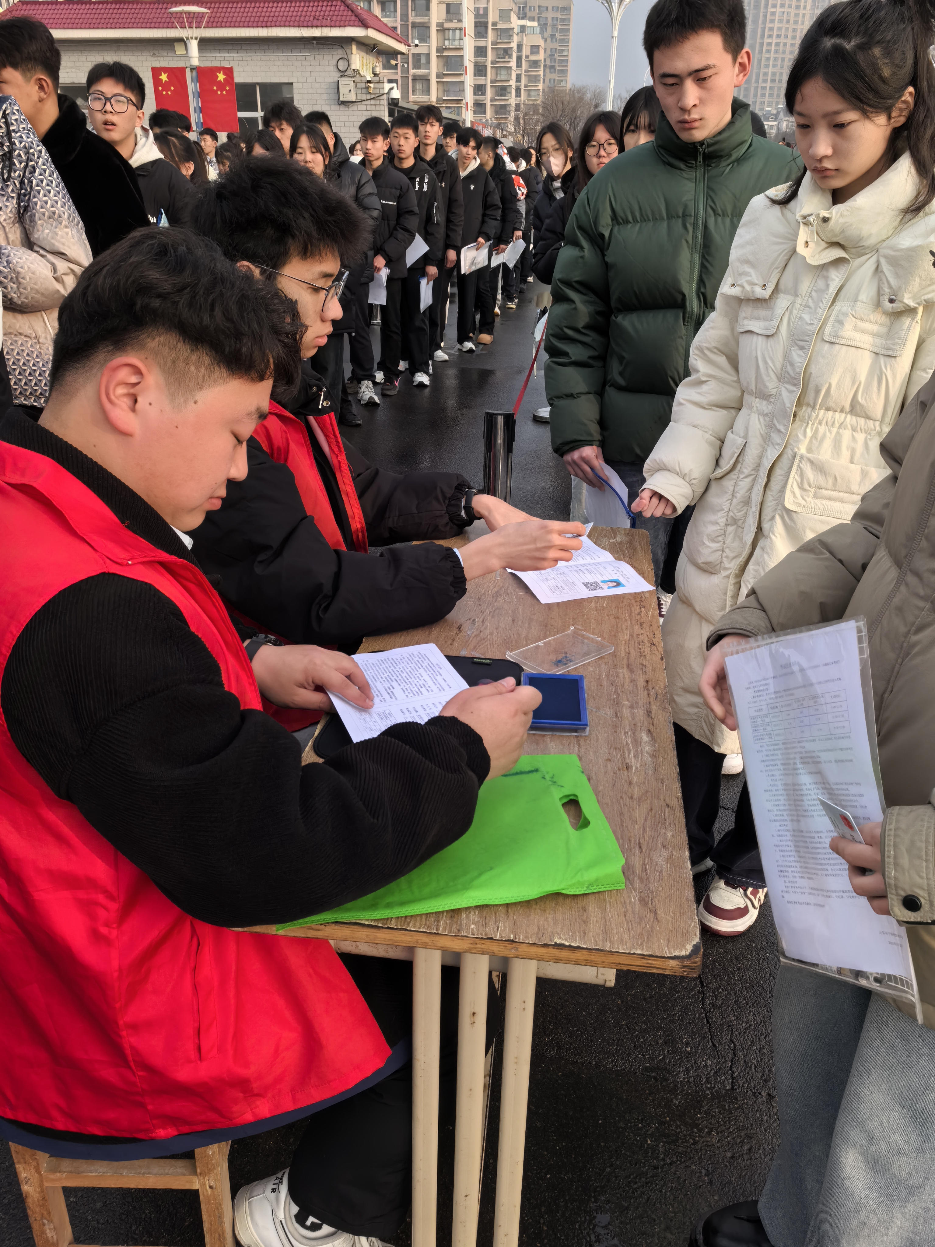 在工作过程中,我校各位志愿者各司其职,认真履行工作职责,认真对考生进行安检、物品寄存、考务管理以及考生队伍引导等,积极帮助考生解答疑难问题,指明考场路线,体现了高度的责任心。饱满的热情工作状态、周到的服务保障让考生留下了深刻印象,展现了我校志愿者的良好风采。在第二天考试的上午,天降大雨,但我校志愿者克服天气影响,不顾衣服被雨水打湿的影响,认真完成自己的工作职责,让在场的考生深受感动。
