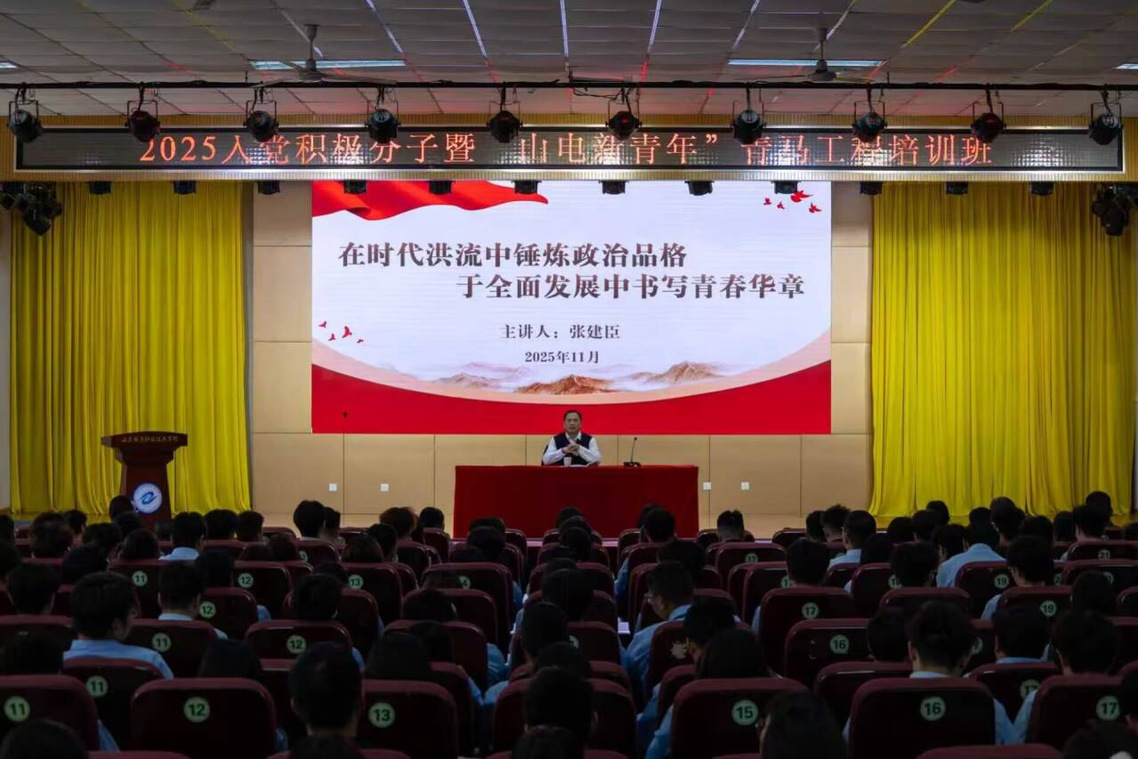 为深入学习贯彻党的二十大精神,进一步加强青年学生思想政治引领,培养新时代青年马克思主义者,11月13日,我校2025年入党积极分子暨“山电新青年”青马工程培训班在学术报告厅举行。学校院长张建臣以“在时代洪流中锤炼政治品格于全面发展中书写青春华章”为主题授课,组织人事处、团委、学生处、各系党团总支书记、财务审计处党支部、第二青年理论学习小组及全体青马学员参加活动。