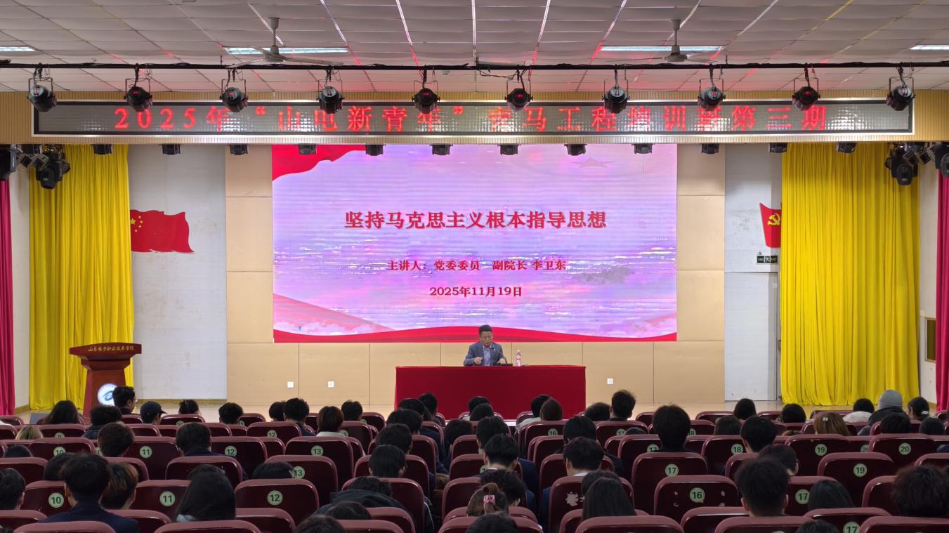 11月19日下午,2025年入党积极分子暨“山电新青年”青马工程培训班开班第三讲在学术报告厅顺利举行。学校党委委员、副院长李卫东授课,第三青年理论学习小组教师、校级青马学员及部分系级青马学员参加。