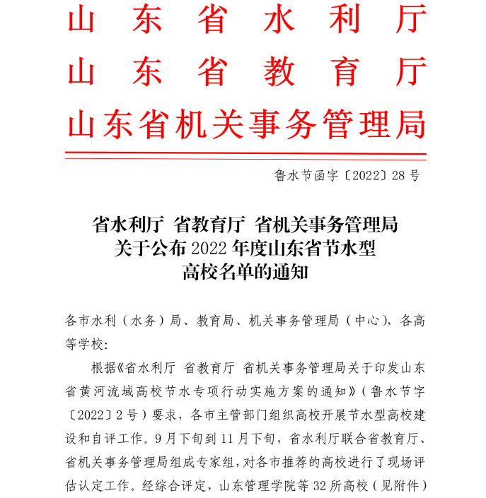 近日,山东省水利厅、教育厅、机关事务管理局联合发文,公布了2022年度山东省节水型高校名单,我校名列其中。