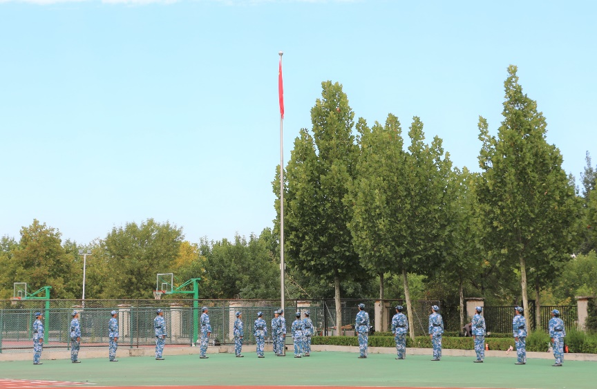 “全体起立,升国旗,奏唱中华人民共和国国歌”,全体参会人员向国旗行注目礼,军训会操在庄严的国歌声中拉开帷幕。