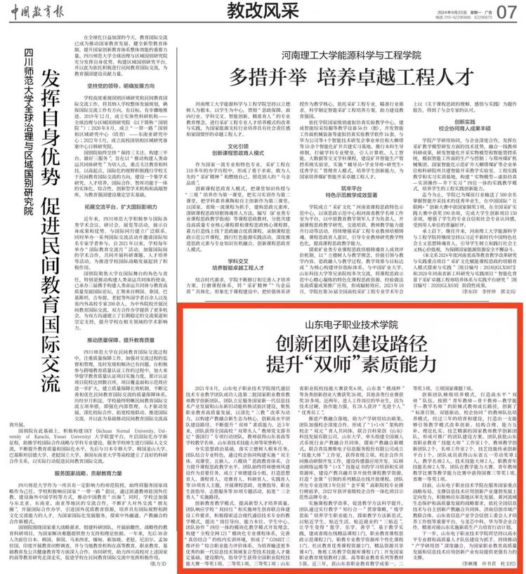 10月18日,中国教育报刊社山东新闻宣传通联工作会议在泰安召开,会上对先进单位和先进个人进行了表彰。山东电子职业技术学院被评为2024年度高校教育新闻宣传先进单位,一人获评高校教育新闻宣传先进个人。