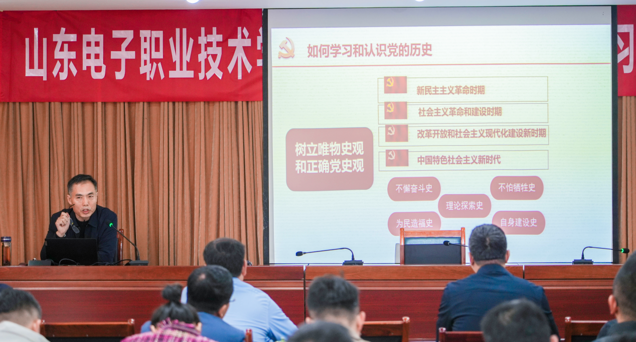 会议邀请山东高校“中国共产党人精神谱系”宣讲团成员,省委党史研究院研究一处处长、一级调研员韩立明作题为《从党的历史中汲取奋进力量,全面推进中国式现代化》专题辅导报告。报告深入阐述了如何学习和认识党的历史,介绍了山东党组织在革命时期的光辉历史,说明了伟大建党精神是推进中国式现代化的强大力量。报告内容丰富、论述精辟、联系实际、解疑释惑,既有理论高度,又有现实针对性,为学校广大党员干部深入学习领会党的历史和精神实质提供了重要理论参考。