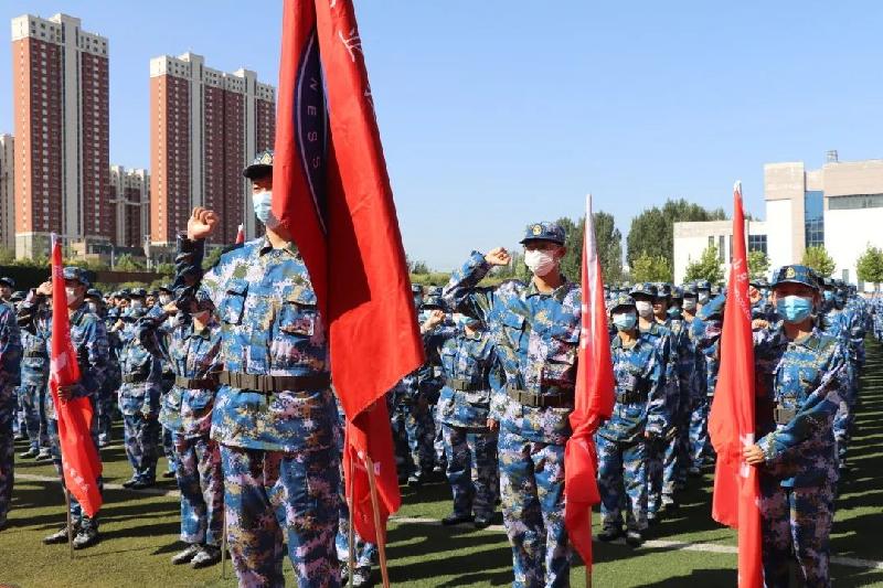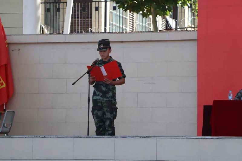 教官李睿哲带领2022级新生宣誓:服从命令,听从指挥,尊重教官,刻苦训练,恪守纪律,不怕困难,团结友爱,努力学习,自强不息,知行合一,立志成才,报效祖国。
