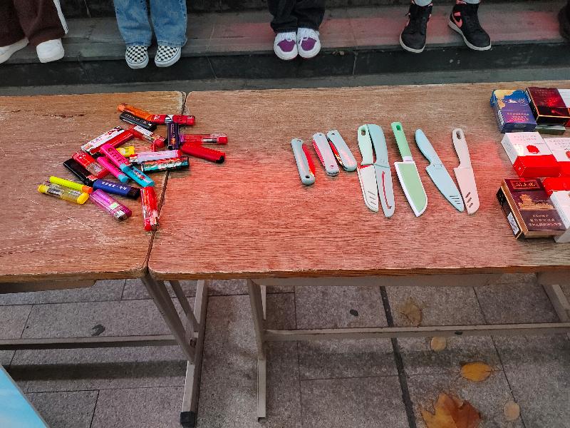 11月9日下午,学生公寓服务中心全体学生干部在餐厅广场前进行了违禁物品展示。本次展出的内容包括大功率电锅、酒精瓶、发胶、火机、烟、管制刀具等物品。本次展示意义重大,让同学们了解到什么是公寓违禁品,以及使用违禁品对人身造成的危害,大大提高同学们对安全的认知。